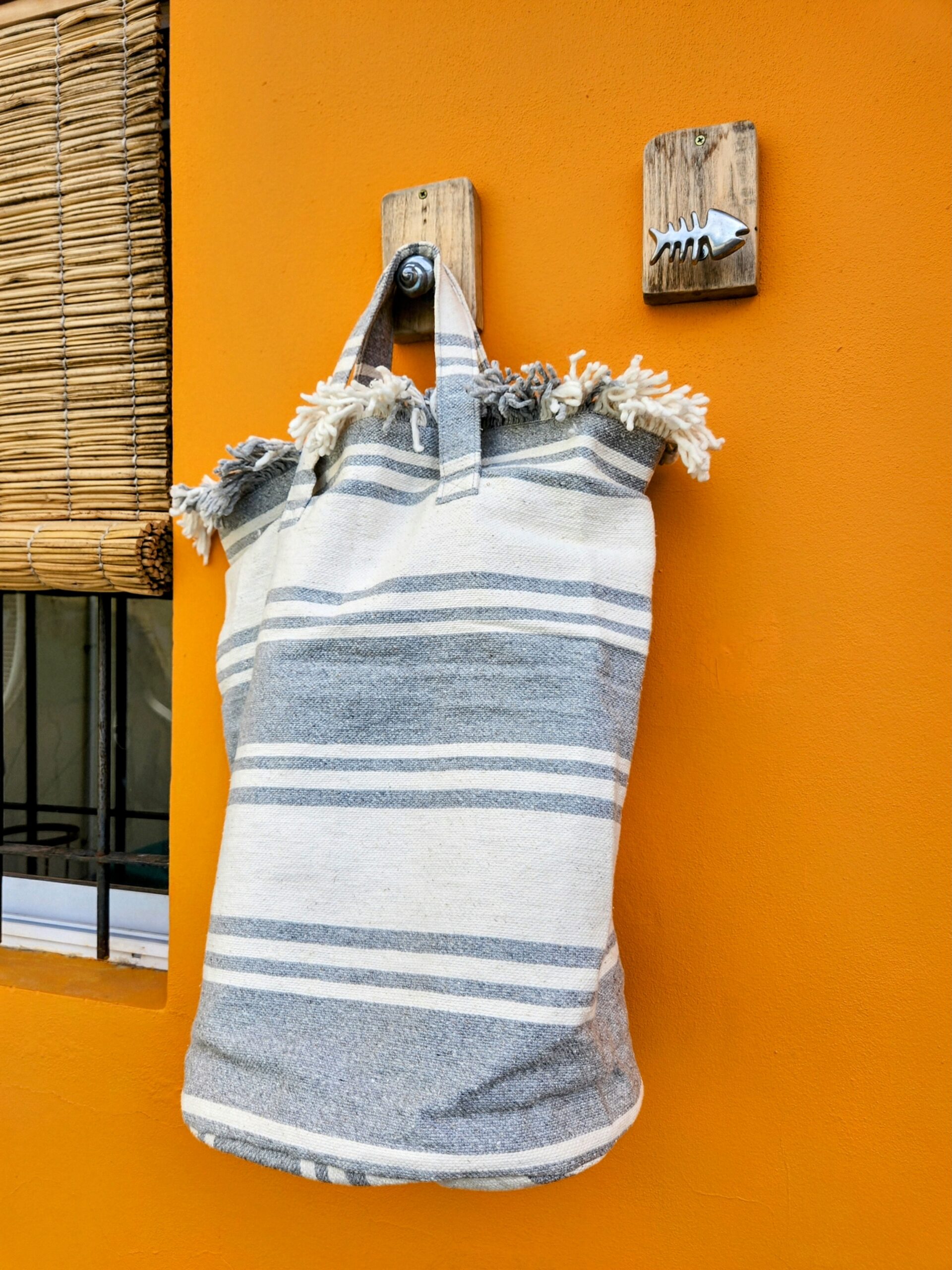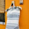 Bolsón de colgar o apoyar para ropa u otros usos, forrado en tela de PVC color blanca que lo hace impermeable.
